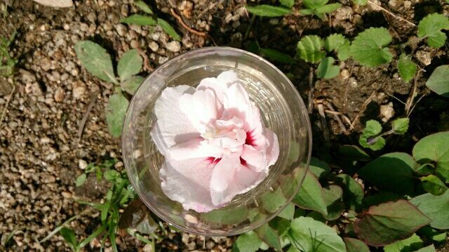 湧水をいれたクリスタルやガラスの器に花を浮かべ、